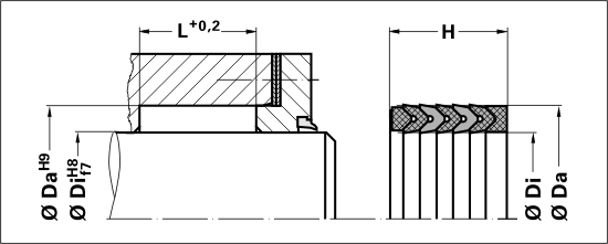 Fabric chevron sealing set for difficult operating conditions, standard series for pressures up to 500 bar in hydraulic applications.