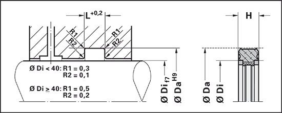 The 1R4 rotary seal sets are mainly used for two-way sealing of rotary transmission leadthroughs in rotating assemblies, pivot drives, hose reels and in hydraulic systems for machine tools.The shape of the dynamic sealing surfaces results in the formation of a lubricant trap, which stops the seal from running dry.