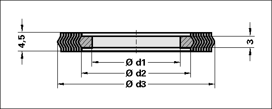 Spiral-wound gasket with inner ring for outside pressure, available in various material combinations and pressure stages.